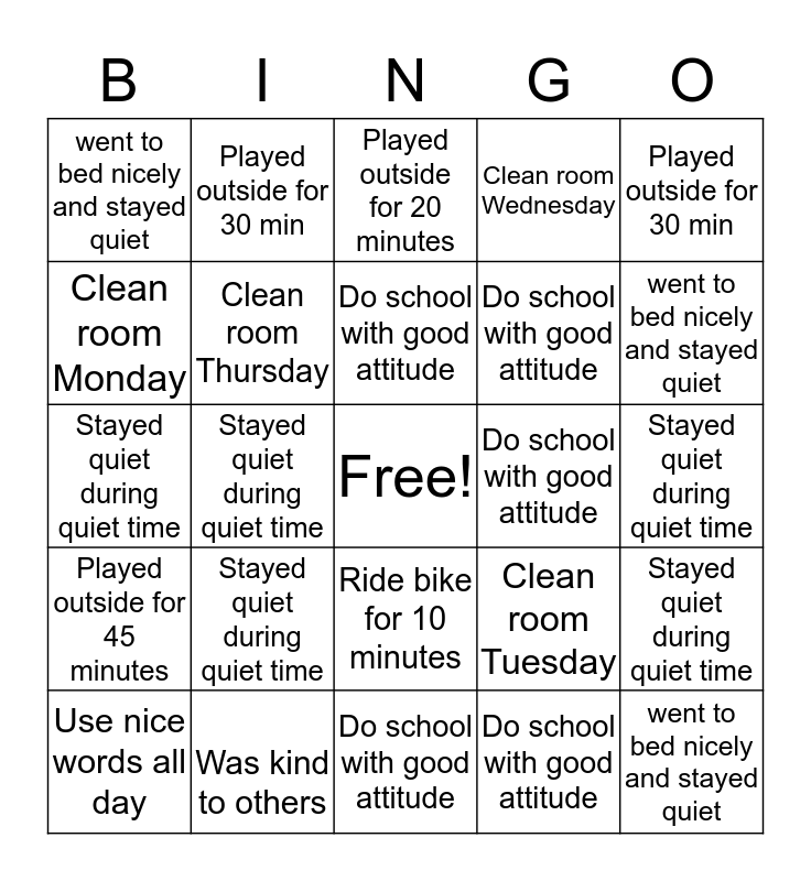 This bingo card has a free space and 24 words: Stayed quiet during quiet time, Was kind to others, Do school with good attitude, Use nice words all day, Played outside for 30 min, went to bed nicely and stayed quiet, Clean room Monday, Played outside for 30 min, Do school with good attitude, Ride bike for 10 minutes, Do school with good attitude, Stayed quiet during quiet time, Clean room Tuesday, Stayed quiet during quiet time, Clean room Thursday, Do school with good attitude, Stayed quiet during quiet time, Played outside for 20 minutes, went to bed nicely and stayed quiet, Stayed quiet during quiet time, went to bed nicely and stayed quiet, Played outside for 45 minutes, Clean room Wednesday and Do school with good attitude.