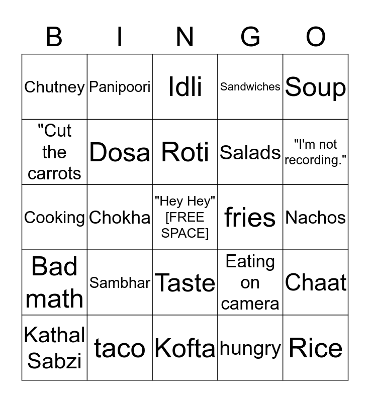 This bingo card has a free space and 29 words: Kathal Sabzi, Dal Dhokli, Chokha, Fried Rice, Chutney, Idli, Dosa, Sambhar, fries, taco, Nachos, Rice, Kofta, hungry, "I'm not recording.", Aroma, Taste, Bad math, Soup, Cooking, Eating on camera, Yoga, Salads, "Cut the carrots, Sandwiches, Panipoori, Chaat, Roti and Paratha.