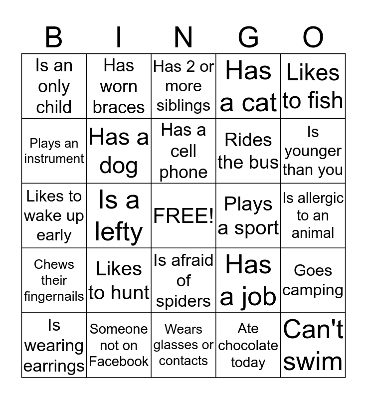This bingo card has a free space and 24 words: Likes to hunt, Someone not on Facebook, Has a cell phone, Is wearing earrings, Likes to fish, Is an only child, Plays an instrument, Has worn braces, Plays a sport, Is afraid of spiders, Rides the bus, Likes to wake up early, Has a job, Goes camping, Has a dog, Ate chocolate today, Is allergic to an animal, Has 2 or more siblings, Is younger than you, Is a lefty, Can't swim, Chews their fingernails, Has a cat and Wears glasses or contacts.