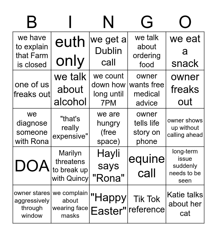This bingo card has a free space and 24 words: Marilyn threatens to break up with Quincy, we complain about wearing face masks, we count down how long until 7PM, owner stares aggressively through window, we eat a snack, we have to explain that Farm is closed, one of us freaks out, euth only, owner tells life story on phone, Hayli says "Rona", owner wants free medical advice, we diagnose someone with Rona, equine call, long-term issue suddenly needs to be seen, we talk about alcohol, Tik Tok reference, owner shows up without calling ahead, we get a Dublin call, owner freaks out, "that's really expensive", Katie talks about her cat, DOA, we talk about ordering food and "Happy Easter".