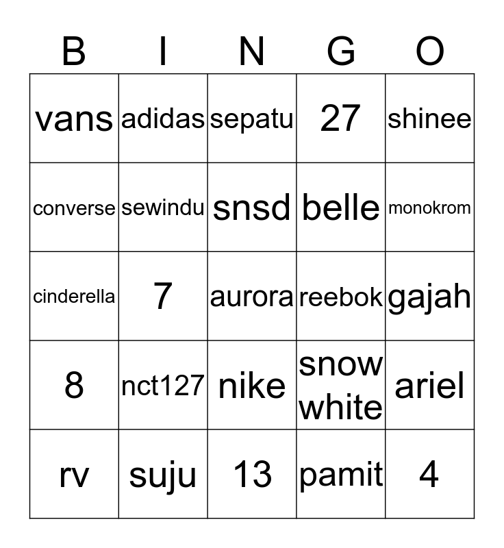 This bingo card has a free space and 24 words: nct127, suju, snsd, rv, shinee, vans, converse, adidas, reebok, nike, belle, cinderella, snow white, ariel, sewindu, pamit, gajah, sepatu, monokrom, 7, 4, 8, 27 and 13.