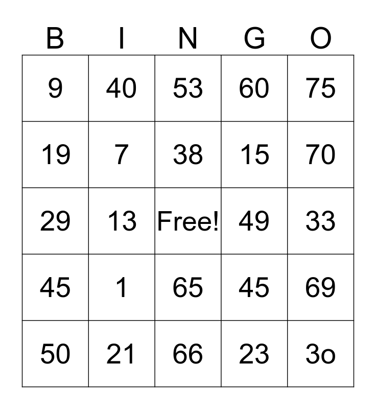 This bingo card has a free space and 24 words: 1, 21, 38, 50, 75, 9, 19, 40, 49, 65, 15, 29, 45, 69, 7, 23, 33, 53, 70, 13, 3o, 45, 60 and 66.