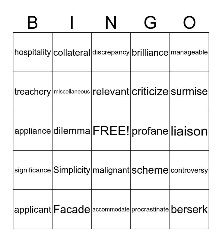 This bingo card has a free space and 24 words: Simplicity, Facade, relevant, applicant, manageable, hospitality, treachery, collateral, profane, malignant, criticize, appliance, scheme, controversy, miscellaneous, procrastinate, liaison, discrepancy, surmise, dilemma, berserk, significance, brilliance and accommodate.
