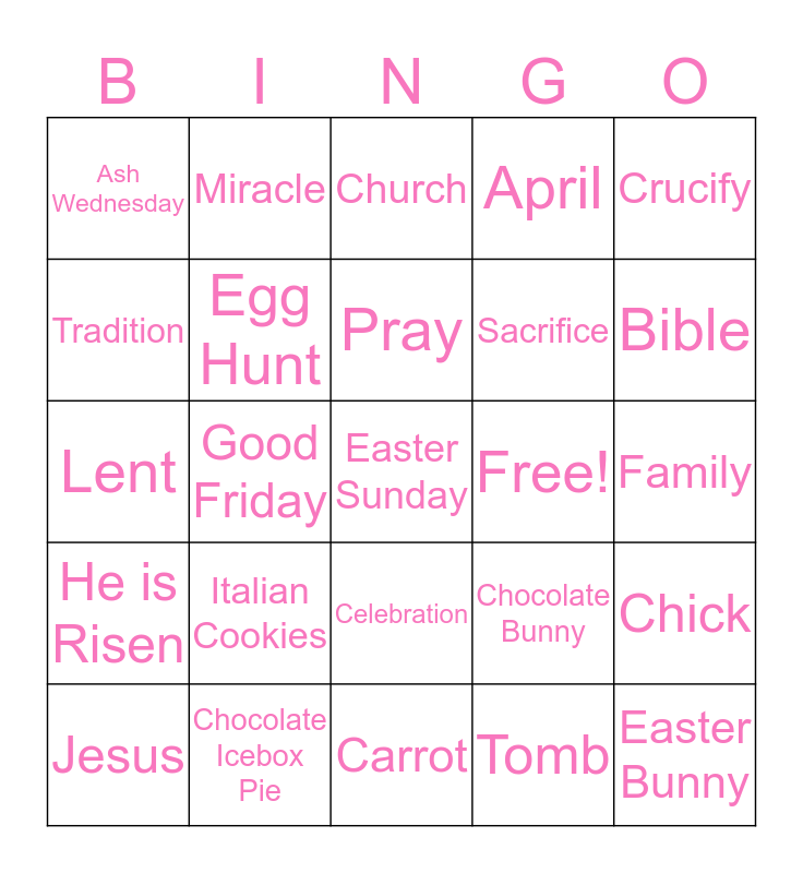 This bingo card has a free space and 29 words: Jesus, Holy Week, Good Friday, Palm Sunday, Ash Wednesday, Church, Egg Hunt, Italian Cookies, Free!, Chocolate Icebox Pie, Family, Easter Bunny, Carrot, Tomb, Bible, Pontas Pilate, Celebration, He is Risen, Crucify, Lent, Chocolate Bunny, God, Sacrifice, Tradition, April, Miracle, Chick, Pray and Resurrection.