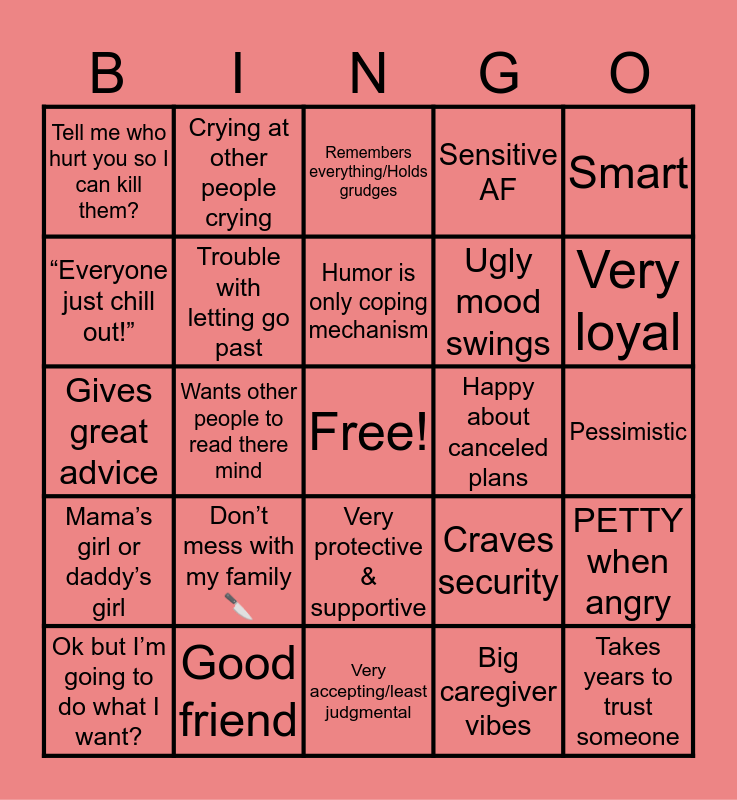 This bingo card has a free space and 24 words: Don’t mess with my family 🔪, Good friend, Humor is only coping mechanism, Ok but I’m going to do what I want?, Smart, Tell me who hurt you so I can kill them?, “Everyone just chill out!”, Crying at other people crying, Happy about canceled plans, Very protective & supportive, Ugly mood swings, Gives great advice, Craves security, PETTY when angry, Trouble with letting go past, Big caregiver vibes, Pessimistic, Remembers everything/Holds grudges, Very loyal, Wants other people to read there mind, Takes years to trust someone, Mama’s girl or daddy’s girl, Sensitive AF and Very accepting/least judgmental.