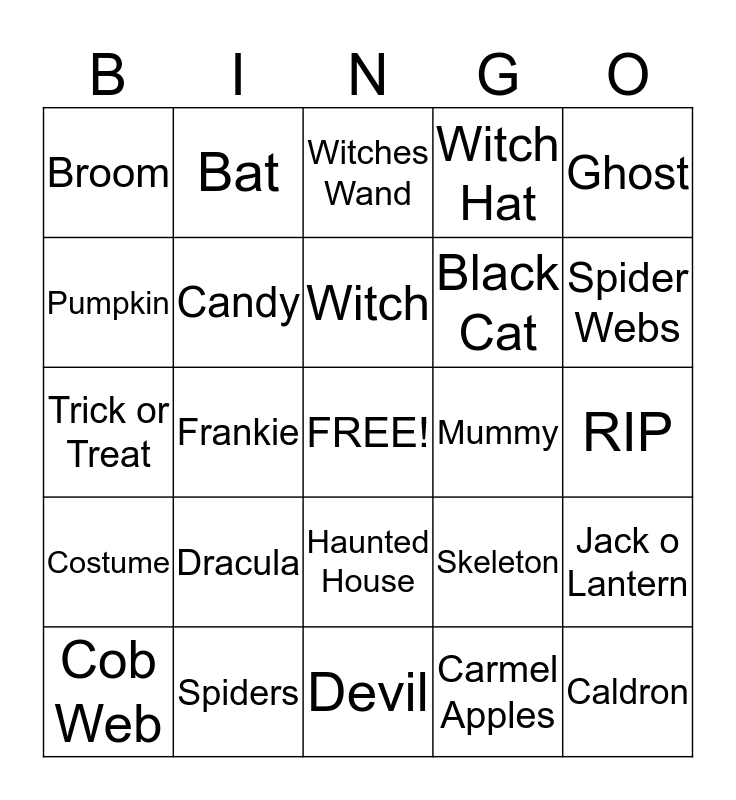 This bingo card has a free space and 24 words: Dracula, Spiders, Witch, Cob Web, Ghost, Broom, Pumpkin, Bat, Mummy, Haunted House, Black Cat, Trick or Treat, Skeleton, Jack o Lantern, Candy, Carmel Apples, RIP, Witches Wand, Spider Webs, Frankie, Caldron, Costume, Witch Hat and Devil.