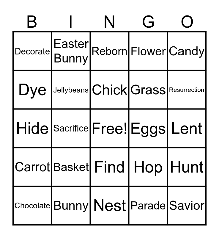 This bingo card has a free space and 24 words: Basket, Bunny, Chick, Chocolate, Candy, Decorate, Dye, Easter Bunny, Eggs, Find, Grass, Hide, Hop, Hunt, Jellybeans, Parade, Lent, Reborn, Resurrection, Sacrifice, Savior, Carrot, Flower and Nest.