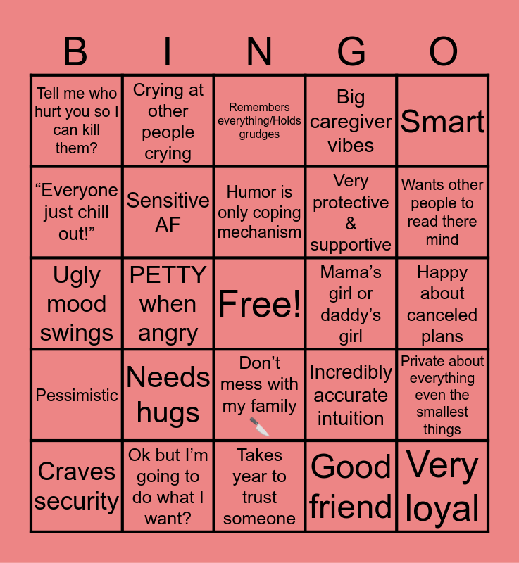 This bingo card has a free space and 26 words: Don’t mess with my family 🔪, Good friend, Humor is only coping mechanism, Ok but I’m going to do what I want?, Smart, Tell me who hurt you so I can kill them?, “Everyone just chill out!”, Crying at other people crying, Happy about canceled plans, Incredibly accurate intuition, Very protective & supportive, Ugly mood swings, Private about everything even the smallest things, Craves security, PETTY when angry, Trouble with letting go past, Big caregiver vibes, Pessimistic, Remembers everything/Holds grudges, Very loyal, Wants other people to read there mind, Takes year to trust someone, Mama’s girl or daddy’s girl, Needs hugs, Sensitive AF and Most accepting person/extremely understanding.