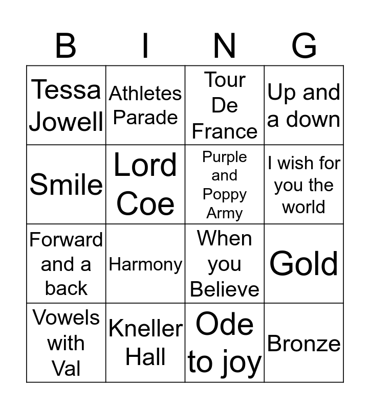 This bingo card has 32 words: London 2012, Team GB, Gold, Tokyo, Bronze, Purple and Poppy Army, Smile, Bandstand, Athletes Parade, Heroes, I wish for you the world, Tour De France, Help for Heroes, Rugby World Cup, Kneller Hall, Hockey World Cup, One Day Like This, When you Believe, Run, You're the voice, Sweet Caroline, Three Little Birds, Ode to joy, Resli's sketch sessions, Vowels with Val, Up and a down, Forward and a back, Lord Coe, Tessa Jowell, Whizzbee, Silver and Harmony.