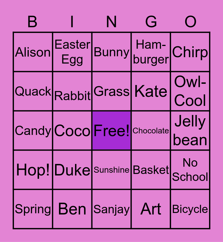This bingo card has a free space and 34 words: Anya, Jeff, Cubby, Rainbow, Jelly bean, Quack, Rabbit, Sanjay, Kate, Bicycle, Candy, Easter Egg, Art, Luna, Hop!, Coco, Sunshine, Chocolate, No School, Spring, Ben, VA, Ham-burger, Owl-Cool, Outside, Duke, Bunny, UNC, Chirp, Alison, Peeps, Grass, Basket and Trisha.
