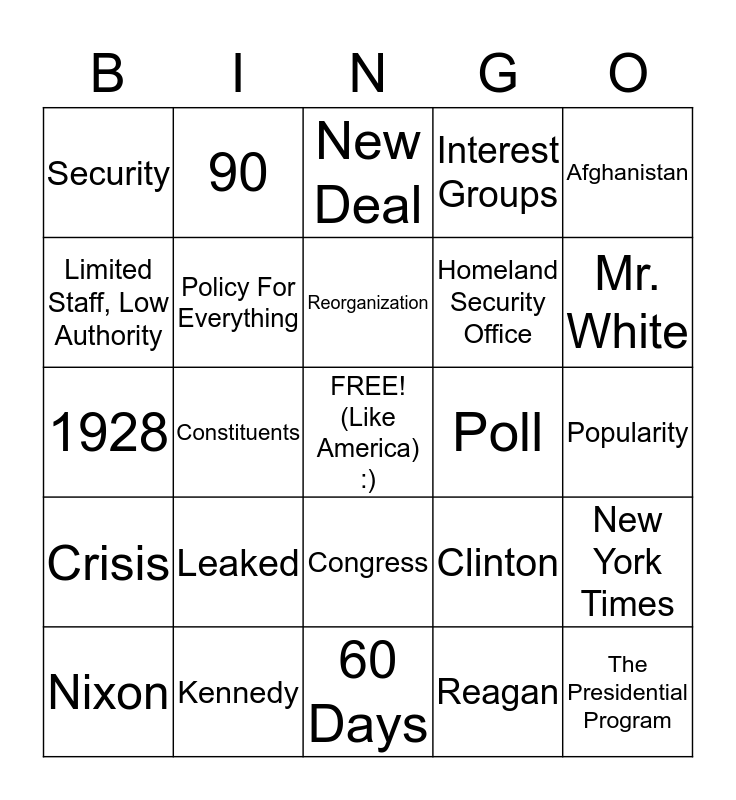 This bingo card has a free space and 24 words: Leaked, Kennedy, Reorganization, Nixon, Afghanistan, Security, Limited Staff, Low Authority, 90, Poll, Congress, Homeland Security Office, 1928, Clinton, New York Times, Policy For Everything, Reagan, Popularity, New Deal, Mr. White, Constituents, The Presidential Program, Crisis, Interest Groups and 60 Days.