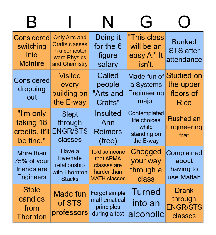 This bingo card has a free space and 24 words: Have a love/hate relationship with Thornton Stacks, Made fun of STS professors, Called people "Arts and Crafts", Stole candies from Thornton, Bunked STS after attendance, Considered switching into McIntire, Considered dropping out, Only Arts and Crafts classes in a semester were Physics and Chemistry, Contemplated life choices while standing on the E-way, Told someone that APMA classes are harder than MATH classes, Made fun of a Systems Engineering major, "I'm only taking 18 credits. It'll be fine.", Chegged your way through a class, Complained about having to use Matlab, Visited every building on the E-way, Turned into an alcoholic, Rushed an Engineering frat, Doing it for the 6 figure salary, Studied on the upper floors of Rice, Slept through ENGR/STS classes, Drank through ENGR/STS classes, More than 75% of your friends are Engineers, "This class will be an easy A." It isn't. and Forgot simple mathematical principles during a test.