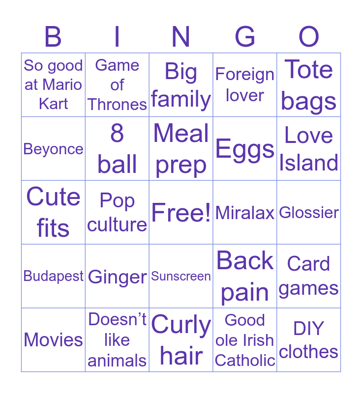 This bingo card has a free space and 24 words: Ginger, Doesn’t like animals, Meal prep, Movies, Tote bags, So good at Mario Kart, Beyonce, Game of Thrones, Miralax, Sunscreen, Eggs, Cute fits, Back pain, Card games, 8 ball, Good ole Irish Catholic, Glossier, Big family, Love Island, Pop culture, DIY clothes, Budapest, Foreign lover and Curly hair.