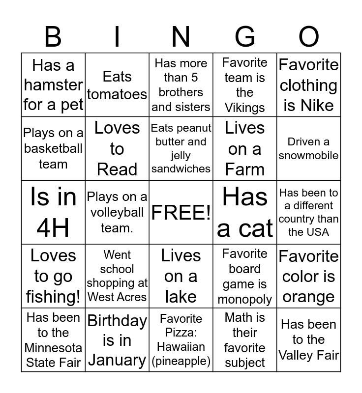 This bingo card has a free space and 24 words: Went school shopping at West Acres, Birthday is in January, Eats peanut butter and jelly sandwiches, Has been to the Minnesota State Fair, Favorite clothing is Nike, Has a hamster for a pet, Plays on a basketball team, Eats tomatoes, Has a cat, Lives on a lake, Lives on a Farm, Is in 4H, Favorite board game is monopoly, Favorite color is orange, Loves to Read, Math is their favorite subject, Has been to a different country than the USA, Has more than 5 brothers and sisters, Driven a snowmobile, Plays on a volleyball team., Has been to the Valley Fair, Loves to go fishing!, Favorite team is the Vikings and Favorite Pizza: Hawaiian (pineapple).
