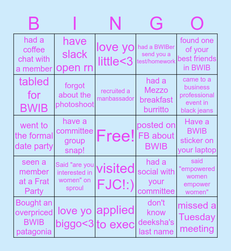This bingo card has a free space and 24 words: Bought an overpriced BWIB patagonia, Said "are you interested in women" on sproul, recruited a manbassador, don't know deeksha's last name, found one of your best friends in BWIB, had a coffee chat with a member, have slack open rn, love yo little<3, posted on FB about BWIB, Have a BWIB sticker on your laptop, went to the formal date party, forgot about the photoshoot, had a social with your committee, said "empowered women empower women", tabled for BWIB, love yo biggo<3, applied to exec, had a BWIBer send you a test/homework, came to a business professional event in black jeans, seen a member at a Frat Party, have a committee group snap!, visited FJC!:), had a Mezzo breakfast burritto and missed a Tuesday meeting.