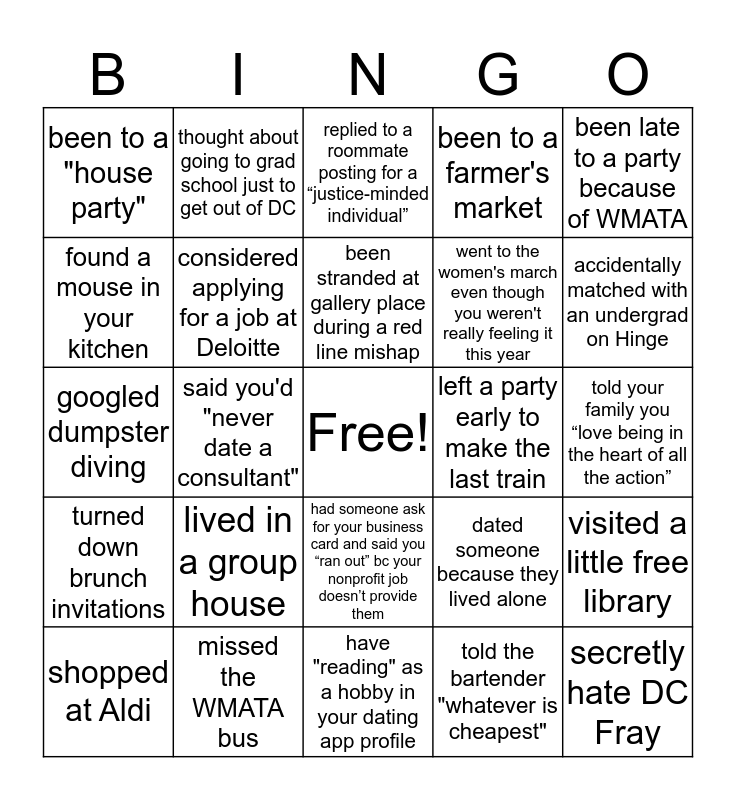 This bingo card has a free space and 24 words: lived in a group house, missed the WMATA bus, been stranded at gallery place during a red line mishap, shopped at Aldi, been late to a party because of WMATA, been to a "house party", found a mouse in your kitchen, thought about going to grad school just to get out of DC, left a party early to make the last train, had someone ask for your business card and said you “ran out” bc your nonprofit job doesn’t provide them, went to the women's march even though you weren't really feeling it this year, googled dumpster diving, dated someone because they lived alone, visited a little free library, considered applying for a job at Deloitte, told the bartender "whatever is cheapest", told your family you “love being in the heart of all the action”, replied to a roommate posting for a “justice-minded individual”, accidentally matched with an undergrad on Hinge, said you'd "never date a consultant", secretly hate DC Fray, turned down brunch invitations, been to a farmer's market and have "reading" as a hobby in your dating app profile.