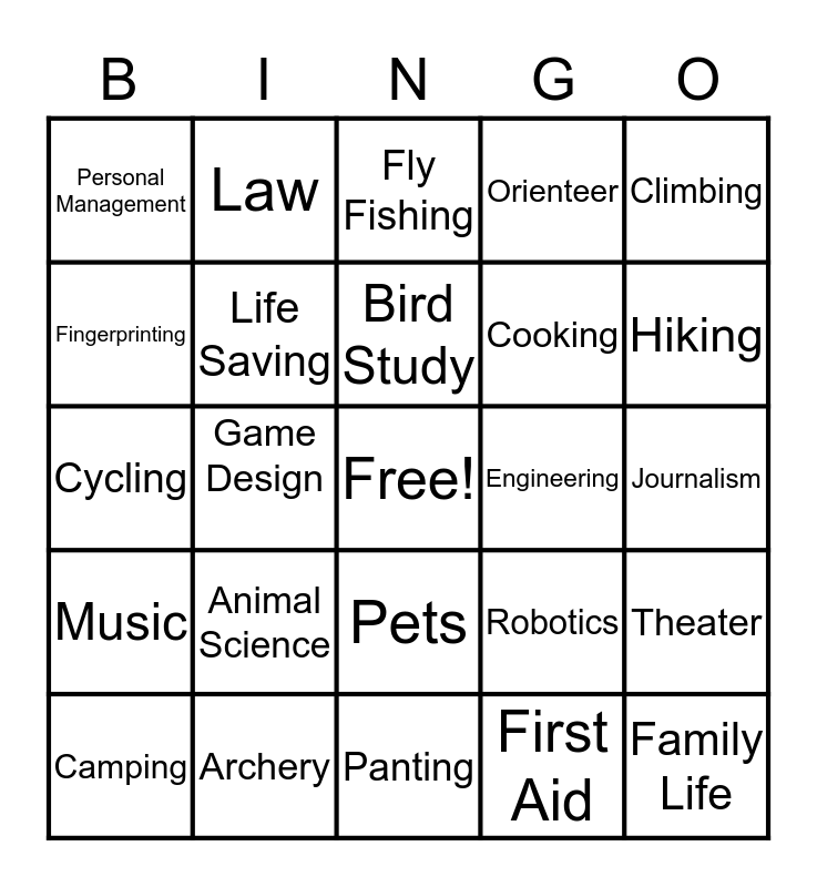 This bingo card has a free space and 24 words: Animal Science, Archery, Bird Study, Camping, Climbing, Personal Management, Fingerprinting, Law, Engineering, Pets, Cooking, Cycling, Robotics, Theater, Life Saving, First Aid, Journalism, Fly Fishing, Hiking, Game Design, Family Life, Music, Orienteer and Panting.