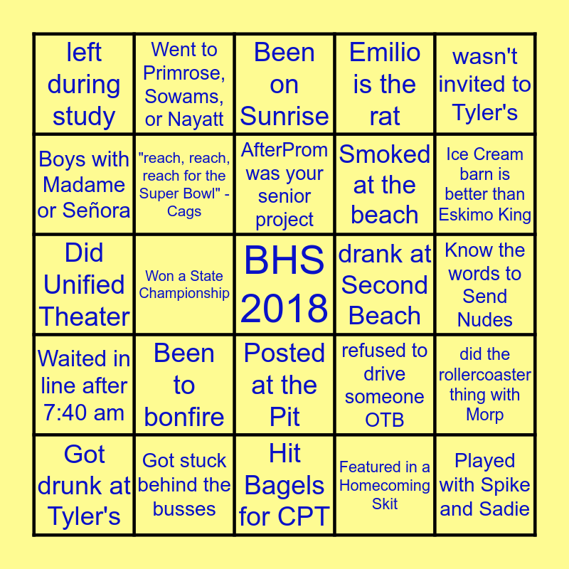 This bingo card has a free space and 24 words: Been to bonfire, Got stuck behind the busses, AfterProm was your senior project, Got drunk at Tyler's, wasn't invited to Tyler's, left during study, Boys with Madame or Señora, Went to Primrose, Sowams, or Nayatt, drank at Second Beach, Posted at the Pit, Smoked at the beach, Did Unified Theater, refused to drive someone OTB, did the rollercoaster thing with Morp, "reach, reach, reach for the Super Bowl" - Cags, Featured in a Homecoming Skit, Know the words to Send Nudes, Been on Sunrise, Ice Cream barn is better than Eskimo King, Won a State Championship, Played with Spike and Sadie, Waited in line after 7:40 am, Emilio is the rat and Hit Bagels for CPT.