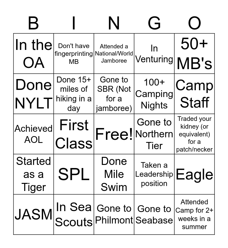This bingo card has a free space and 24 words: SPL, In Sea Scouts, Gone to SBR (Not for a jamboree), JASM, 50+ MB's, In the OA, Done NYLT, Don't have fingerprinting MB, Gone to Northern Tier, Done Mile Swim, 100+ Camping Nights, Achieved AOL, Taken a Leadership position, Eagle, Done 15+ miles of hiking in a day, Gone to Seabase, Traded your kidney (or equivalent) for a patch/necker, Attended a National/World Jamboree, Camp Staff, First Class, Attended Camp for 2+ weeks in a summer, Started as a Tiger, In Venturing and Gone to Philmont.