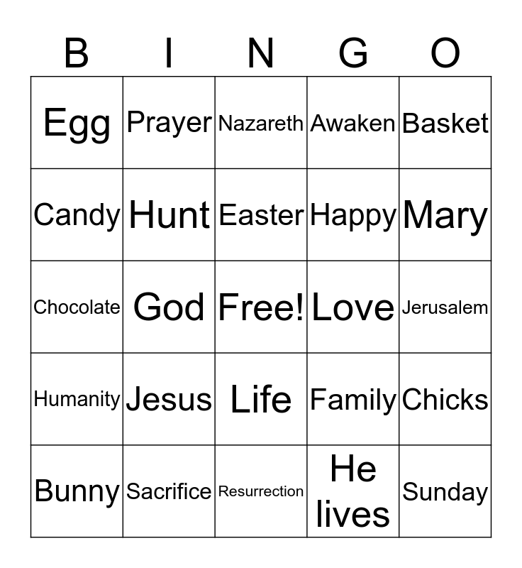 This bingo card has a free space and 25 words: Jesus, Resurrection, Easter, Bunny, Basket, Egg, Candy, Prayer, Love, Life, Happy, Chocolate, Family, Chicks, Hunt, Spring, Jerusalem, Nazareth, Mary, God, Sunday, Sacrifice, Humanity, Awaken and He lives.