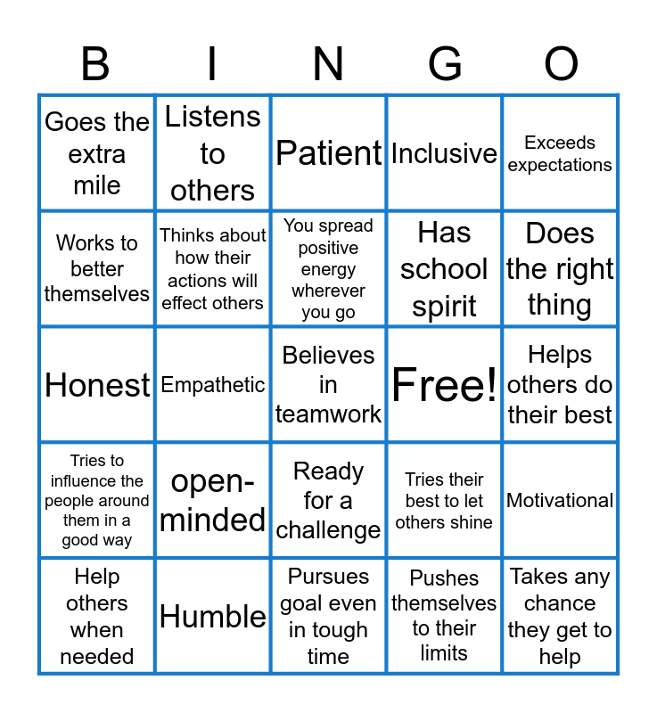 This bingo card has a free space and 24 words: Help others when needed, open-minded, You spread positive energy wherever you go, Pushes themselves to their limits, Exceeds expectations, Goes the extra mile, Listens to others, Patient, Free!, Helps others do their best, Honest, Thinks about how their actions will effect others, Tries their best to let others shine, Motivational, Works to better themselves, Humble, Pursues goal even in tough time, Inclusive, Does the right thing, Tries to influence the people around them in a good way, Empathetic, Ready for a challenge, Has school spirit and Takes any chance they get to help.