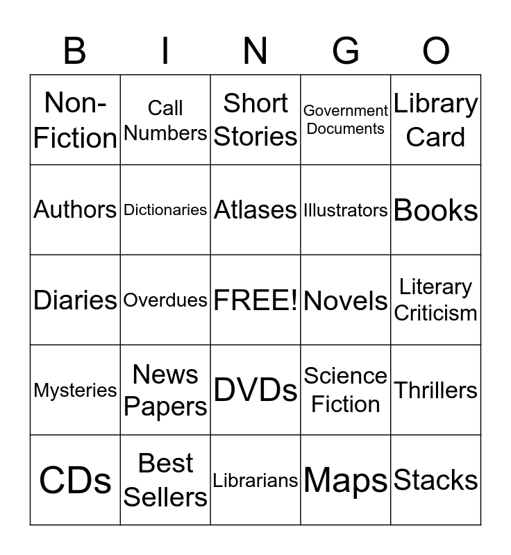 This bingo card has a free space and 45 words: Media Center, Stacks, Reference, CDs, Magazines, Maps, Short Stories, Journals, Library Card, Best Sellers, Government Documents, Novels, DVDs, News Papers, Reading Room, Librarians, Archives, Diaries, Audio- Visual, Books, Call Numbers, Circulation, Archivists, Non- Fiction, Poems, Literary Criticism, Biographies, Bibliographies, Science Fiction, Mysteries, Romance, Thrillers, Fantasy, Folk Tales, Due Date, Overdues, Reserves, Manuscripts, Fairy Tales, Atlases, Authors, Illustrators, Computers, Dictionaries and Encyclopedias.