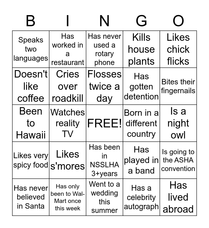 This bingo card has a free space and 24 words: Likes s'mores, Has only been to Wal-Mart once this week, Flosses twice a day, Has never believed in Santa, Likes chick flicks, Speaks two languages, Doesn't like coffee, Has worked in a restaurant, Born in a different country, Has been in NSSLHA 3+years, Has gotten detention, Been to Hawaii, Has played in a band, Is going to the ASHA convention, Cries over roadkill, Has a celebrity autograph, Is a night owl, Has never used a rotary phone, Bites their fingernails, Watches reality TV, Has lived abroad, Likes very spicy food, Kills house plants and Went to a wedding this summer.