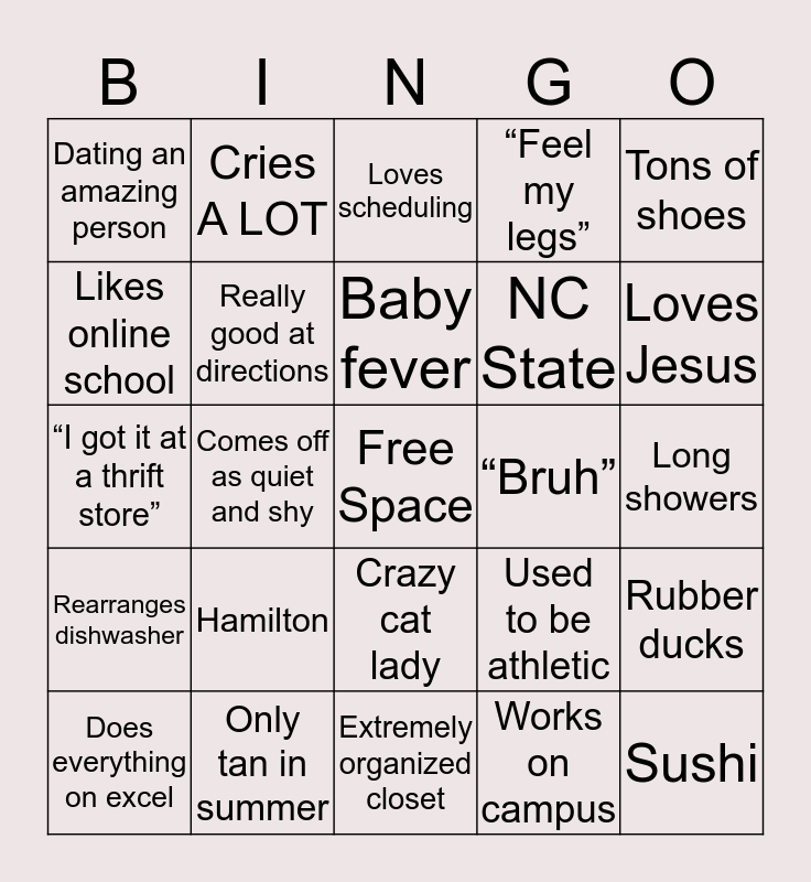 This bingo card has a free space and 24 words: Hamilton, Only tan in summer, Baby fever, Does everything on excel, Tons of shoes, Dating an amazing person, Likes online school, Cries A LOT, “Bruh”, Crazy cat lady, NC State, “I got it at a thrift store”, Used to be athletic, Rubber ducks, Really good at directions, Works on campus, Long showers, Loves scheduling, Loves Jesus, Comes off as quiet and shy, Sushi, Rearranges dishwasher, “Feel my legs” and Extremely organized closet.