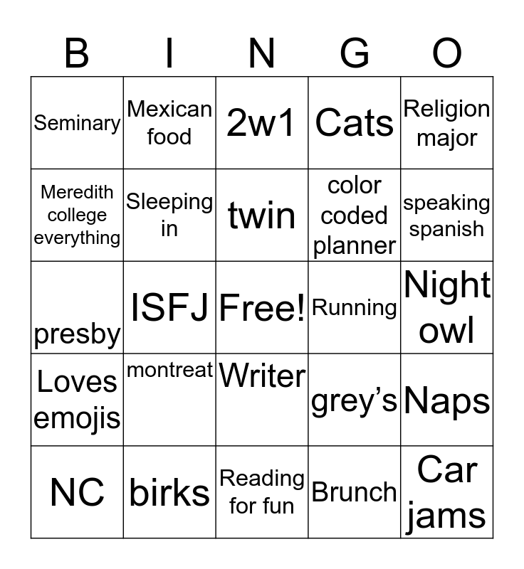 This bingo card has a free space and 24 words: montreat, birks, twin, NC, Religion major, Seminary, Meredith college everything, Mexican food, Running, Writer, color coded planner, presby, grey’s, Naps, Sleeping in, Brunch, Night owl, 2w1, speaking spanish, ISFJ, Car jams, Loves emojis, Cats and Reading for fun.