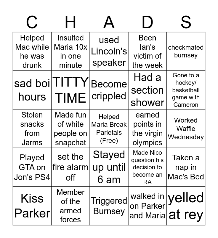 This bingo card has a free space and 24 words: set the fire alarm off, Member of the armed forces, Become crippled, Kiss Parker, checkmated burnsey, Helped Mac while he was drunk, sad boi hours, Insulted Maria 10x in one minute, earned points in the virgin olympics, Stayed up until 6 am, Had a section shower, Stolen snacks from Jarms, Made Nico question his decision to become an RA, Taken a nap in Mac's Bed, TITTY TIME, walked in on Parker and Maria, Worked Waffle Wednesday, used Lincoln's speaker, Gone to a hockey/ basketball game with Cameron, Made fun of white people on snapchat, yelled at rey, Played GTA on Jon's PS4, Been Ian's victim of the week and Triggered Burnsey.