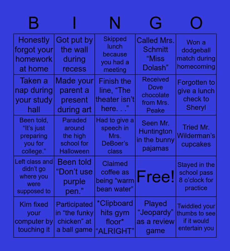 This bingo card has 25 words: Been told “Don’t use purple pen.”, *Clipboard hits gym floor* “ALRIGHT”, Finish the line, “The theater isn’t here. . .”, Kim fixed your computer by touching it, Won a dodgeball match during homecoming, Honestly forgot your homework at home, Taken a nap during your study hall, Got put by the wall during recess, Seen Mr. Huntington in the bunny pajamas, Claimed coffee as being “warm bean water”, Received Dove chocolate from Mrs. Peake, Been told, “It’s just preparing you for college.”, Free!, Stayed in the school pass 8 o’clock for practice, Made your parent a present during art, Twiddled your thumbs to see if it would entertain you, Tried Mr. Wilderman’s cupcakes, Skipped lunch because you had a meeting, Forgotten to give a lunch check to Sheryl, Paraded around the high school for Halloween, Had to give a speech in Mrs. DeBoer’s class, Participated in “the funky chicken” at a ball game, Left class and didn’t go where you were supposed to, Called Mrs. Schmitt “Miss Dolash” and Played “Jeopardy” as a review game.