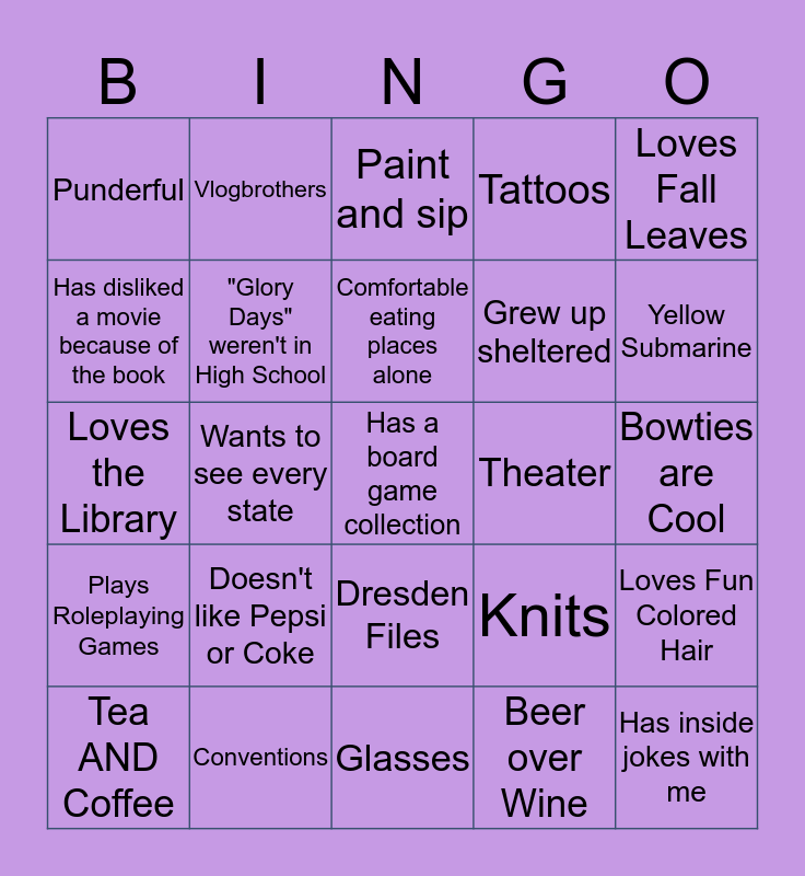 This bingo card has 25 words: Plays Roleplaying Games, Conventions, Has a board game collection, Beer over Wine, Loves Fall Leaves, Punderful, Vlogbrothers, Paint and sip, Theater, Loves Fun Colored Hair, Has disliked a movie because of the book, "Glory Days" weren't in High School, Glasses, Knits, Yellow Submarine, Tea AND Coffee, Wants to see every state, Comfortable eating places alone, Grew up sheltered, Bowties are Cool, Loves the Library, Doesn't like Pepsi or Coke, Dresden Files, Tattoos and Has inside jokes with me.