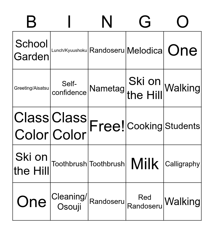 This bingo card has a free space and 50 words: Yellow, Walking, Swimming, Randoseru, Toothbrush, Blackboard, Lunch/Kyuushoku, Black/Navy, Greeting/Aisatsu, Cleaning/Osouji, Self-confidence, Melodica, Calligraphy, Milk, Students, April, Nametag, Cooking, Uniforms, One, Class Color, Red Randoseru, School Garden, Ski on the Hill, Ride the Unicycle, Yellow, Walking, Swimming, Randoseru, Toothbrush, Blackboard, Lunch/ Kyuushoku, Black/ Navy, Greeting/ Aisatsu, Cleaning/ Osouji, Self-confidence, Melodica, Calligraphy, Milk, Students, April, Nametag, Cooking, Uniforms, One, Class Color, Red Randoseru, School Garden, Ski on the Hill and Ride the Unicycle.