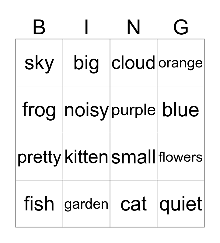 This bingo card has 16 words: garden, flowers, cloud, sky, pretty, big, small, cat, frog, noisy, fish, orange, kitten, blue, purple and quiet.
