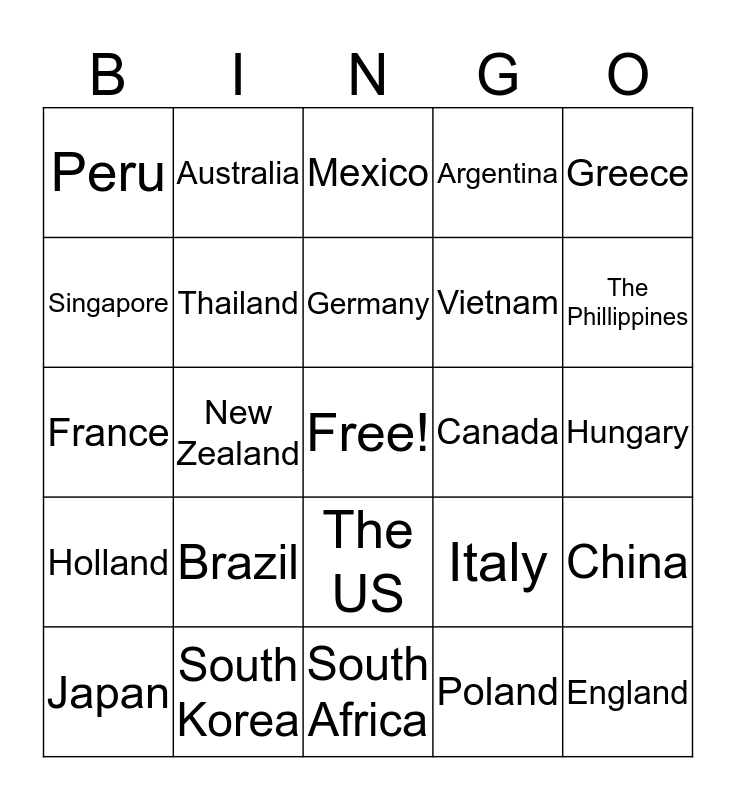 This bingo card has a free space and 24 words: Brazil, South Korea, Germany, Japan, Greece, Peru, Singapore, Australia, Canada, The US, Vietnam, France, Italy, China, Thailand, Poland, Hungary, Mexico, The Phillippines, New Zealand, England, Holland, Argentina and South Africa.