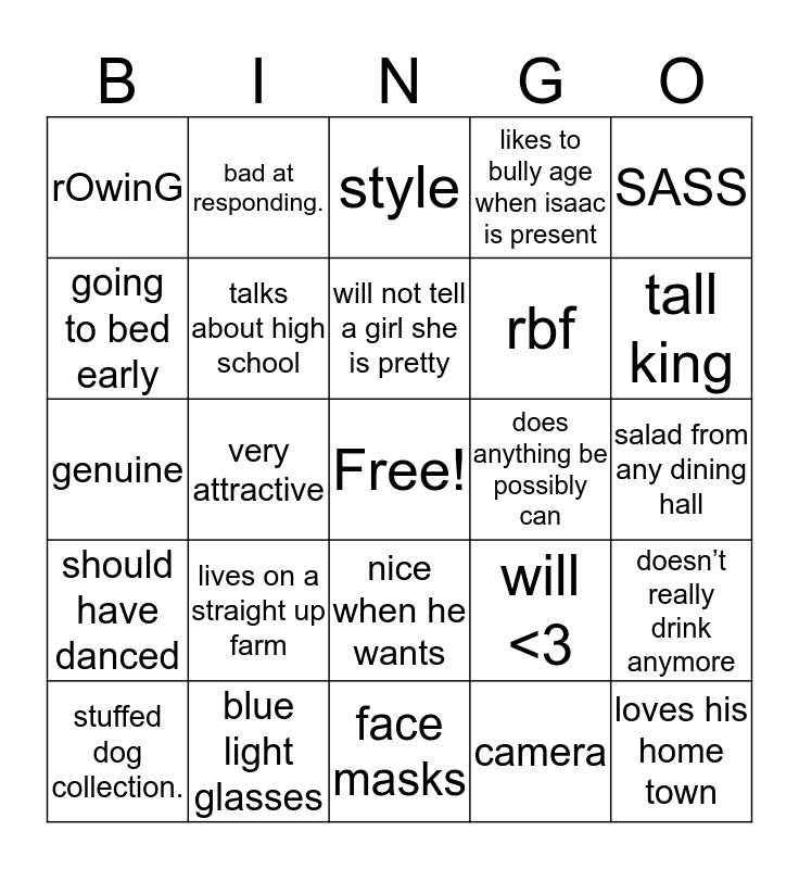This bingo card has a free space and 24 words: lives on a straight up farm, blue light glasses, will not tell a girl she is pretty, stuffed dog collection., SASS, rOwinG, going to bed early, bad at responding., does anything be possibly can, nice when he wants, rbf, genuine, will <3, doesn’t really drink anymore, talks about high school, camera, salad from any dining hall, style, tall king, very attractive, loves his home town, should have danced, likes to bully age when isaac is present and face masks.