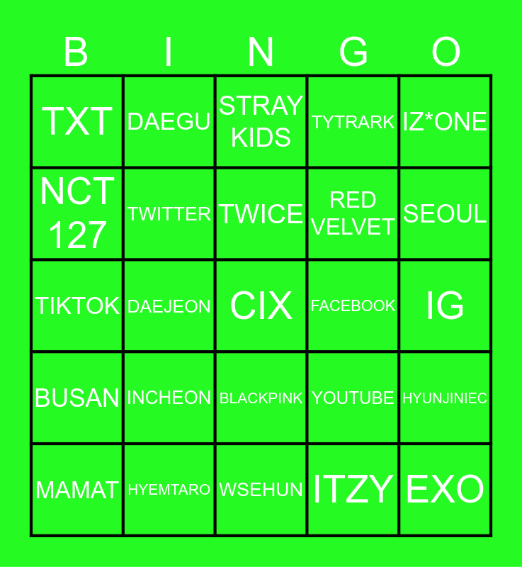 This bingo card has 25 words: INCHEON, WSEHUN, TWICE, MAMAT, IZ*ONE, TXT, NCT 127, DAEGU, FACEBOOK, BLACKPINK, RED VELVET, TIKTOK, YOUTUBE, HYUNJINIEC, TWITTER, EXO, IG, STRAY KIDS, SEOUL, DAEJEON, CIX, HYEMTARO, BUSAN, TYTRARK and ITZY.