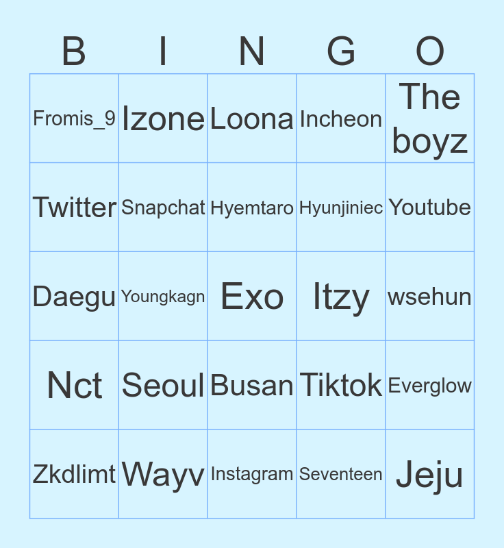This bingo card has 25 words: Nct, Wayv, Exo, Seventeen, The boyz, Fromis_9, Izone, Loona, Itzy, Everglow, Twitter, Snapchat, Instagram, Tiktok, Youtube, Zkdlimt, Youngkagn, Hyemtaro, Hyunjiniec, wsehun, Daegu, Seoul, Busan, Incheon and Jeju.