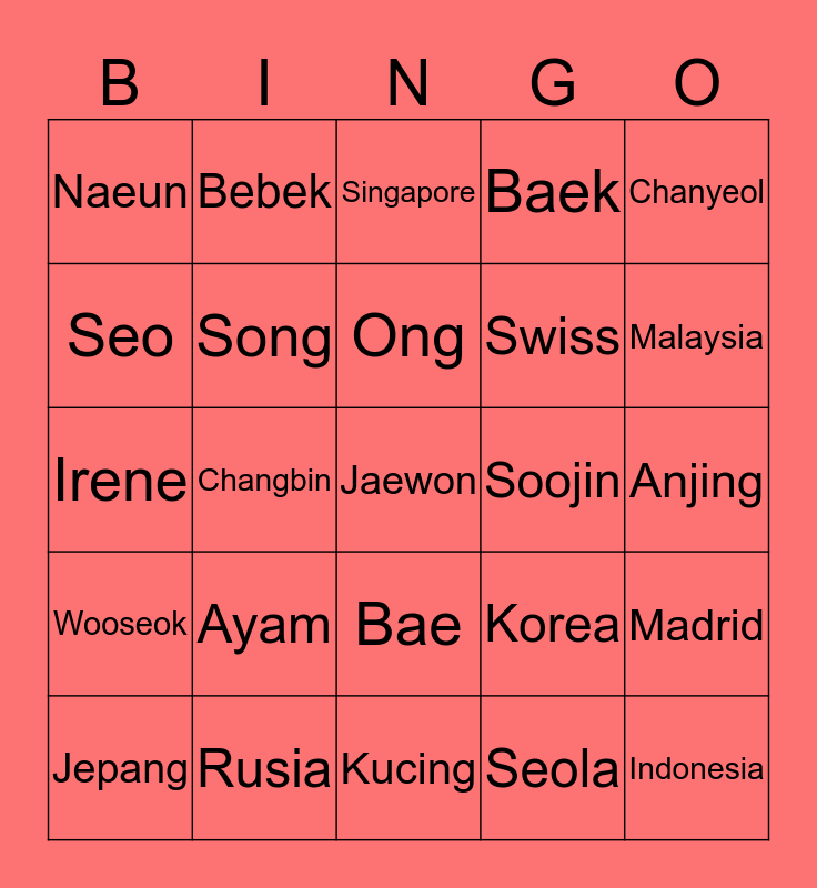 This bingo card has a free space and 35 words: Jung, Choi, Kim, Song, Bae, Baek, Seo, Ryu, Ong, Park, Irene, Chanyeol, Jisoo, Hyunjin, Naeun, Soojin, Seola, Changbin, Wooseok, Indonesia, Korea, Jepang, Madrid, Rusia, Singapore, Malaysia, Thailand, Prancis, Swiss, Anjing, Babi, Kucing, Ayam, Bebek and Sapi.