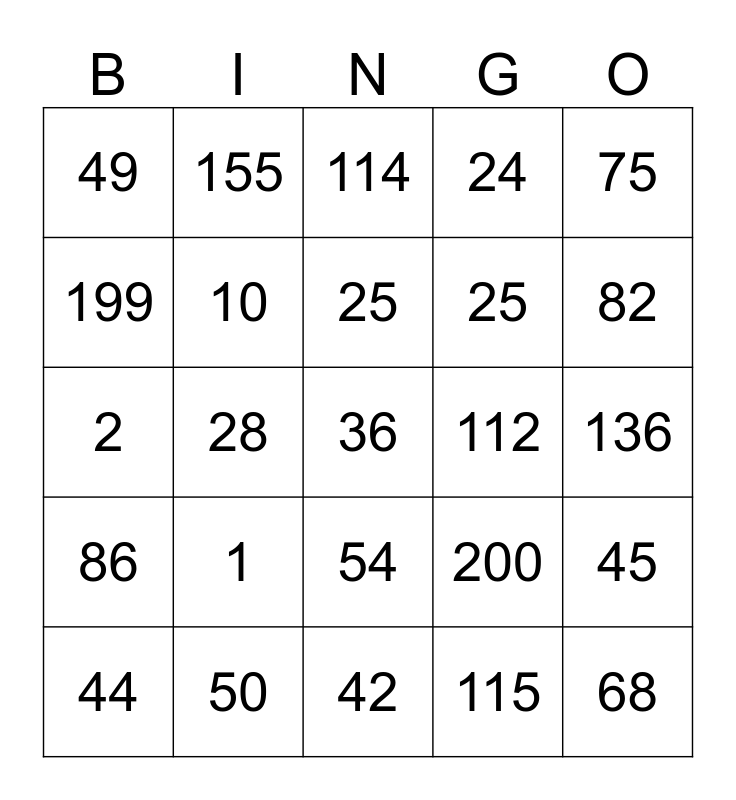 This bingo card has a free space and 24 words: 1, 50, 25, 44, 75, 49, 199, 155, 112, 54, 25, 2, 200, 45, 10, 115, 136, 114, 82, 28, 68, 86, 24 and 42.