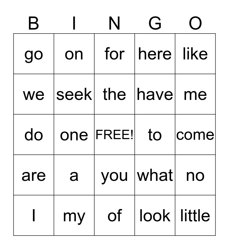 This bingo card has a free space and 24 words: a, my, the, I, like, go, we, on, to, you, have, do, what, no, seek, look, come, for, me, one, little, are, here and of.