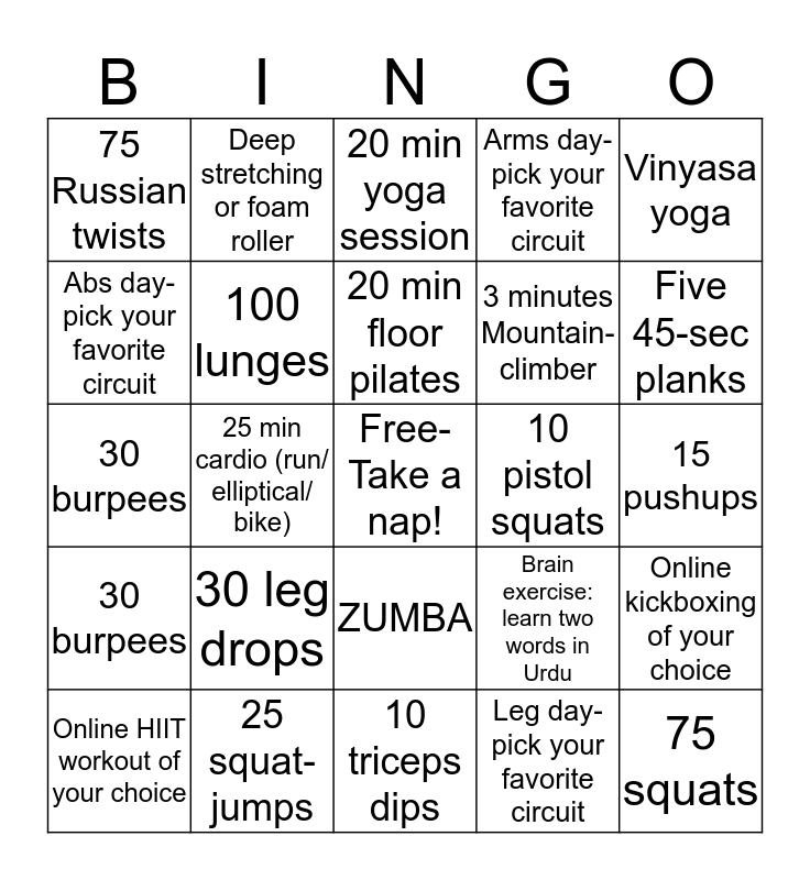 This bingo card has a free space and 29 words: Online HIIT workout of your choice, One dog (or dog-less) walk, 25 min cardio (run/ elliptical/ bike), 2 min Spiderman planks, 75 Russian twists, 20 min yoga session, 100 lunges, 30 leg drops, 10 pistol squats, 25 squat-jumps, 15 pushups, 75 squats, 10 triceps dips, Leg day- pick your favorite circuit, Five 45-sec planks, 50 clamshells, ZUMBA, 30 burpees, Vinyasa yoga, 30 burpees, Brain exercise: learn two words in Urdu, 40 Supermans, 3 minutes Mountain-climber, Abs day- pick your favorite circuit, Arms day- pick your favorite circuit, Deep stretching or foam roller, Online kickboxing of your choice, 20 min floor pilates and Meditation of your choice- 5 min.