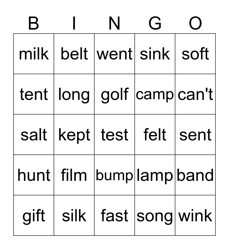 This bingo card has a free space and 24 words: film, silk, golf, gift, soft, milk, tent, belt, felt, bump, camp, salt, lamp, band, long, song, sent, went, can't, kept, wink, hunt, sink and fast.