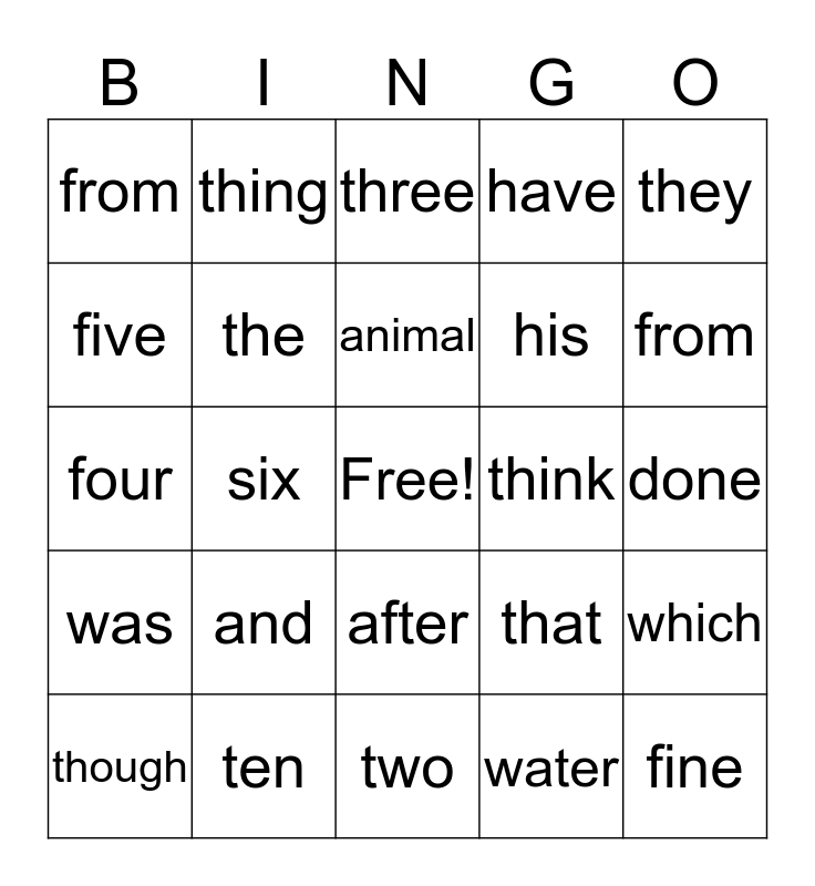 This bingo card has a free space and 24 words: and, ten, animal, though, they, from, five, thing, think, after, his, four, that, which, the, water, done, three, from, six, fine, was, have and two.