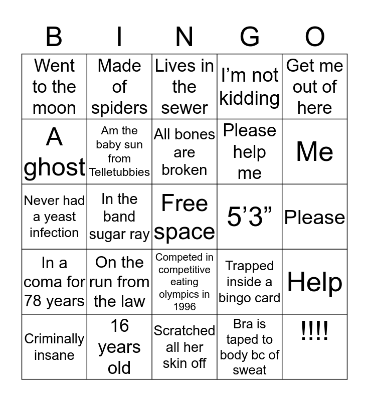 This bingo card has a free space and 24 words: Criminally insane, On the run from the law, All bones are broken, Bra is taped to body bc of sweat, Get me out of here, Went to the moon, Made of spiders, Lives in the sewer, 5’3”, Please, Never had a yeast infection, Am the baby sun from Telletubbies, Trapped inside a bingo card, Help, A ghost, 16 years old, Scratched all her skin off, I’m not kidding, Me, In a coma for 78 years, In the band sugar ray, Competed in competitive eating olympics in 1996, Please help me and !!!!.