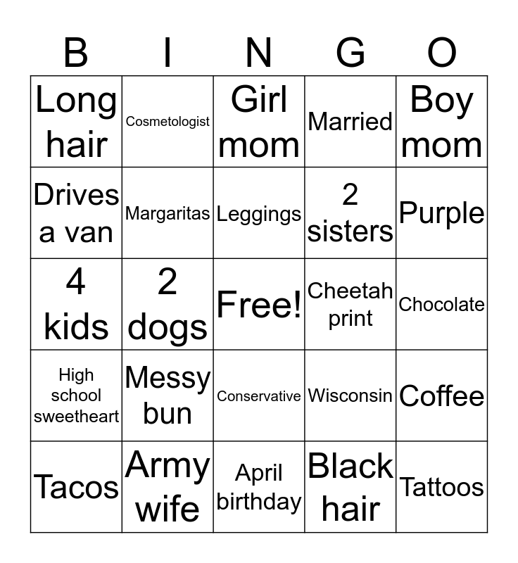 This bingo card has a free space and 24 words: Tacos, Messy bun, Leggings, Black hair, Boy mom, Long hair, Cosmetologist, Girl mom, Cheetah print, Chocolate, 4 kids, Margaritas, Wisconsin, Coffee, Drives a van, Army wife, April birthday, Married, Purple, High school sweetheart, 2 dogs, Conservative, 2 sisters and Tattoos.