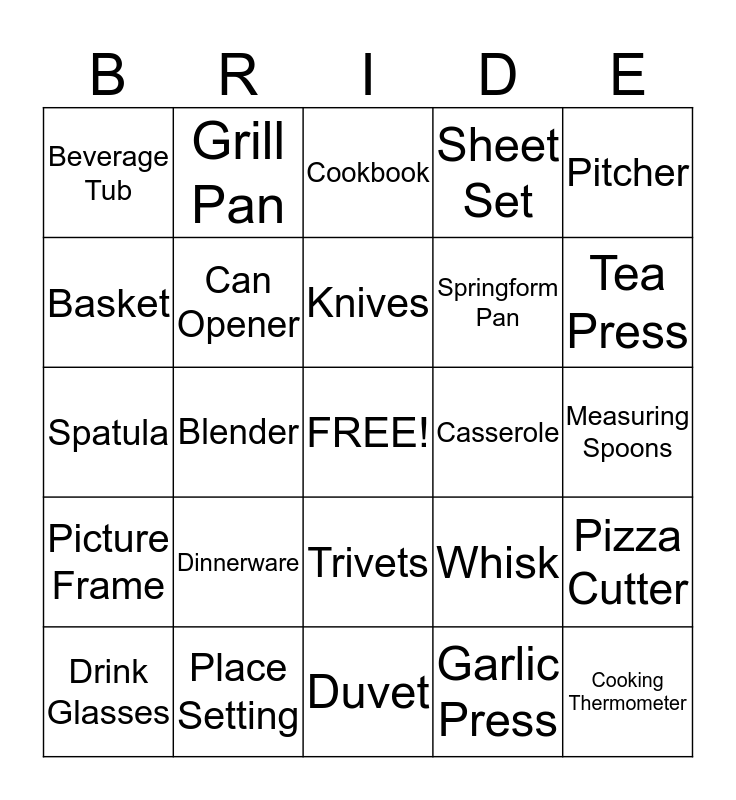 This bingo card has a free space and 24 words: Dinnerware, Place Setting, Knives, Drink Glasses, Pitcher, Beverage Tub, Basket, Grill Pan, Casserole, Trivets, Springform Pan, Spatula, Whisk, Pizza Cutter, Can Opener, Garlic Press, Measuring Spoons, Cookbook, Tea Press, Blender, Cooking Thermometer, Picture Frame, Sheet Set and Duvet.