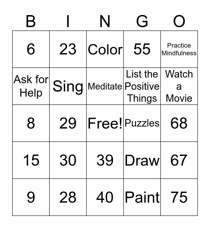 This bingo card has a free space and 75 words: Go for a Walk, Read, Color, Talk to a Friend, Take Deep Breaths, Exercise, Yoga, Take Care of Yourself, Paint, Journal, Eat Healthy, Listen to Music, Puzzles, Watch a Movie, Set Goals, Sing, Laugh Out Loud, Draw, Perform a Random Act of Kindness, Ask for Help, Play a Game, Meditate, List the Positive Things, Practice Mindfulness, 6, 21, 35, 51, 66, 7, 22, 36, 52, 67, 8, 23, 37, 53, 68, 9, 24, 38, 54, 69, 10, 25, 39, 55, 70, 11, 26, 40, 56, 71, 12, 27, 41, 57, 72, 13, 28, 42, 58, 73, 14, 29, 43, 59, 74, 15, 30, 44, 60, 75 and 45.