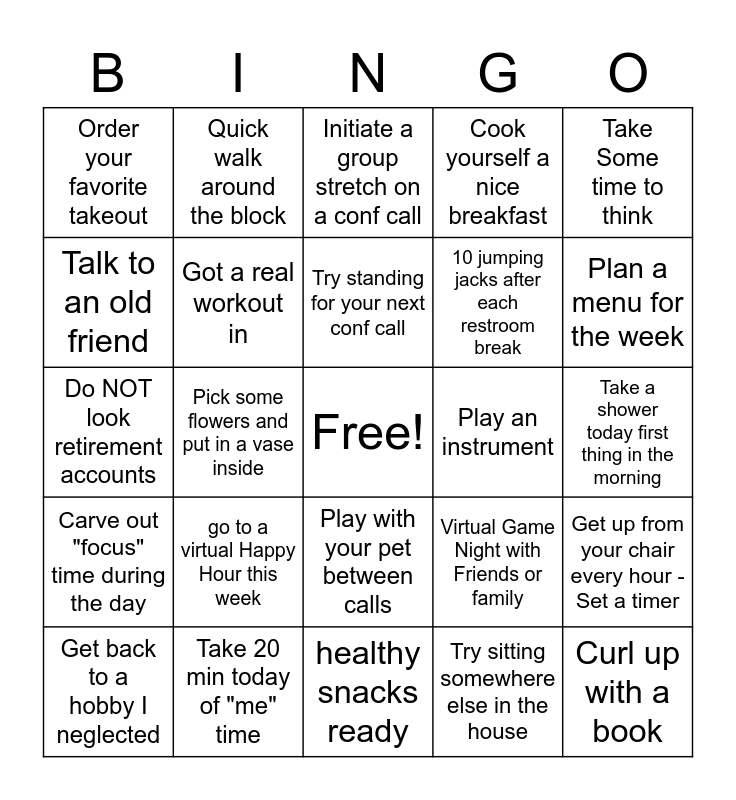 This bingo card has a free space and 42 words: Go For a Walk, Pick some flowers and put in a vase inside, Ask kids to help with cleaning or cooking, Get hands dirty - Gardening, Curl up with a book, Do NOT look retirement accounts, Take 20 min today of "me" time, Go to bed earlier than normal, Cook yourself a nice breakfast, Take a shower today first thing in the morning, Talk to an old friend, go to a virtual Happy Hour this week, Virtual Game Night with Friends or family, Plan a menu for the week, Get back to a hobby I neglected, Get up at least every hour to move today, Exercises or stretch behind my chair, Play an instrument, Take a nap, Order your favorite takeout, Got a real workout in, Play with your pet between calls, Eat lunch away from my home desk, Take Some time to think, Try a new hobby, Create a family workout, Initiate a group stretch on a conf call, Get crafty, Tackle a home improvement project, Carve out "focus" time during the day, Have unstructured coffee chats with co-workers, Try standing for your next conf call, 10 jumping jacks after each restroom break, Get up from your chair every hour - Set a timer, Keep the news off, Play classical or jazz music while working, healthy snacks ready, Try sitting somewhere else in the house, Share something good about your day with conf call participants, 2 hour time blocks for "heavy cognitive work", Quick walk around the block and Family joke moments during the day - Someone tells a joke - Laugh together.