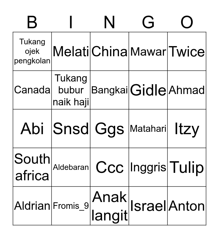This bingo card has a free space and 24 words: Aldebaran, Fromis_9, Bangkai, Aldrian, Twice, Tukang ojek pengkolan, Canada, Melati, Matahari, Ccc, Gidle, Abi, Inggris, Tulip, Tukang bubur naik haji, Israel, Itzy, China, Ahmad, Snsd, Anton, South africa, Mawar and Anak langit.